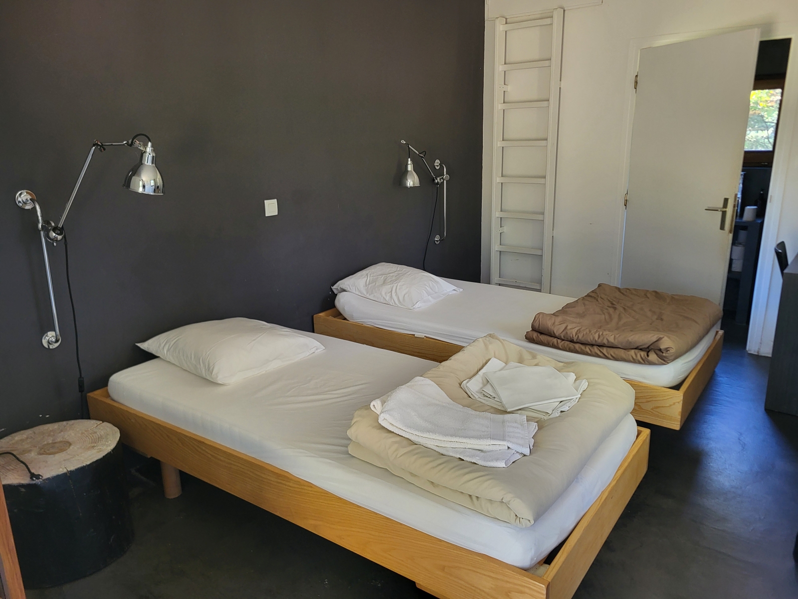 Équipée d'une fenêtre ainsi que d'une porte fenêtre vitrées, la chambre donne sous une coursive extérieure abritant de la pluie et menant jusqu'au sanitaires partagés.