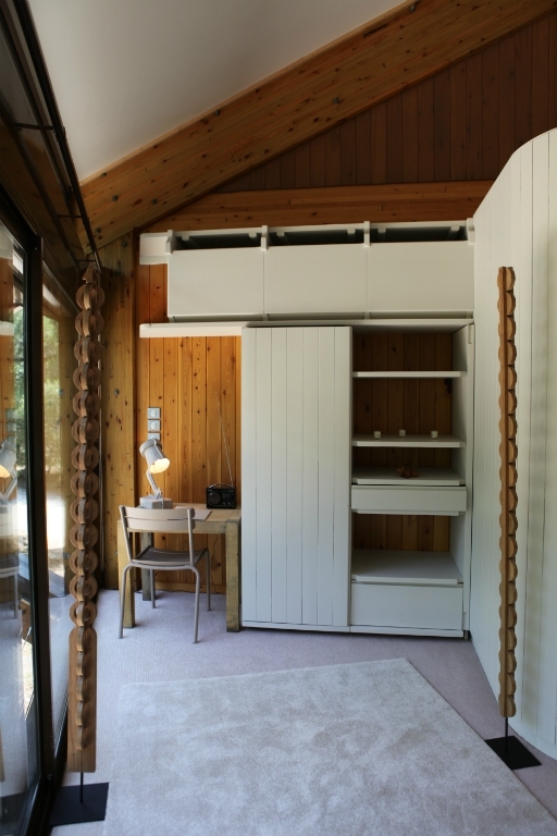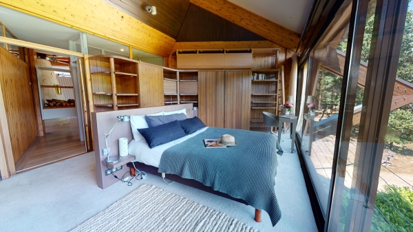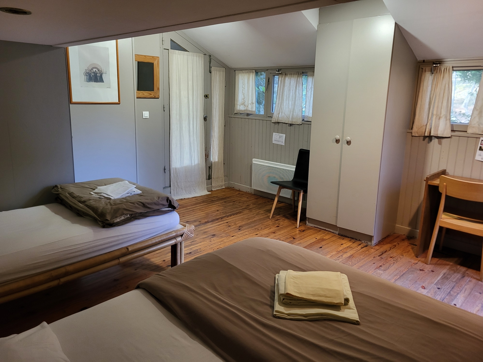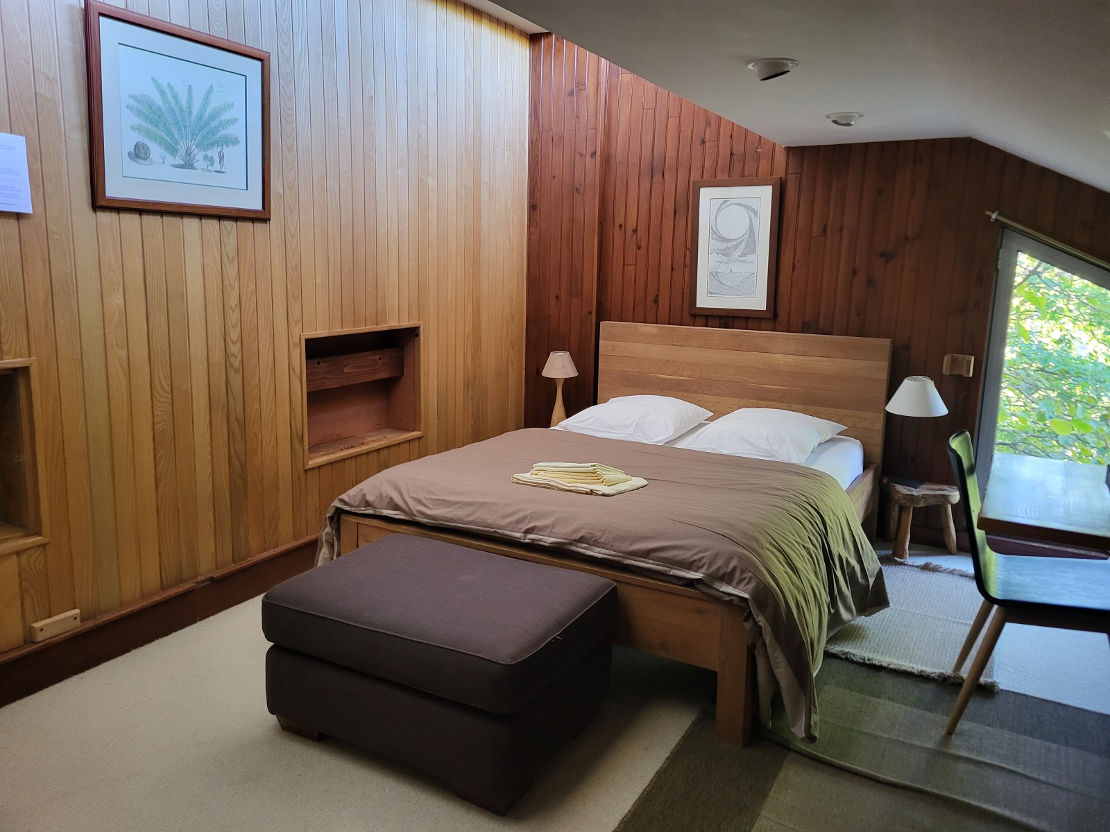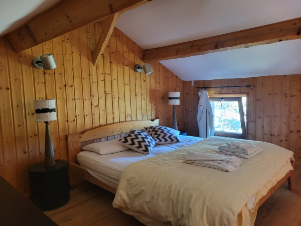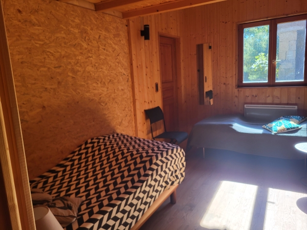 Cette chambre est équipée d'une fenêtre et d'une porte fenêtre vitrée ouvrant directement sur la prairie.