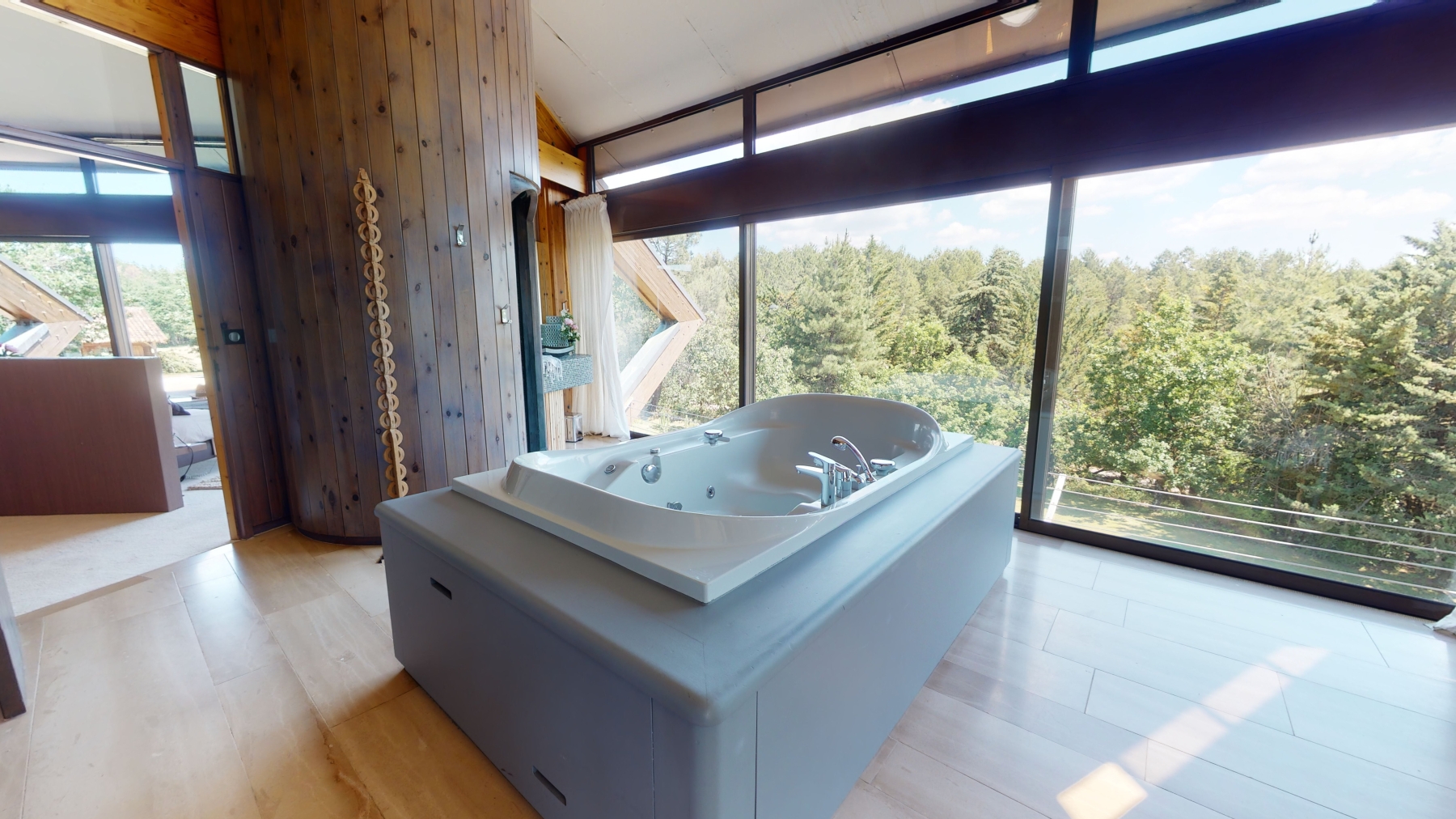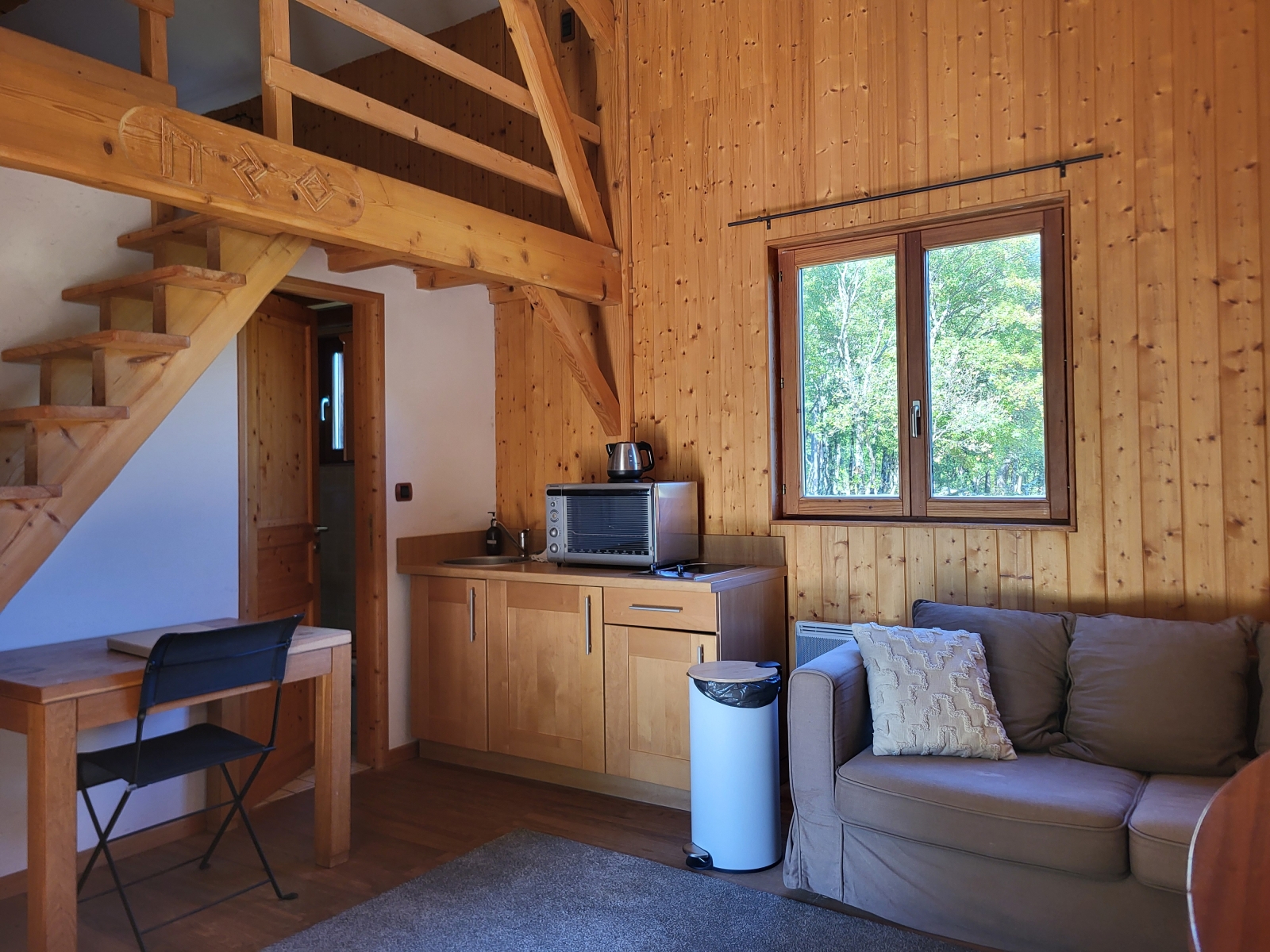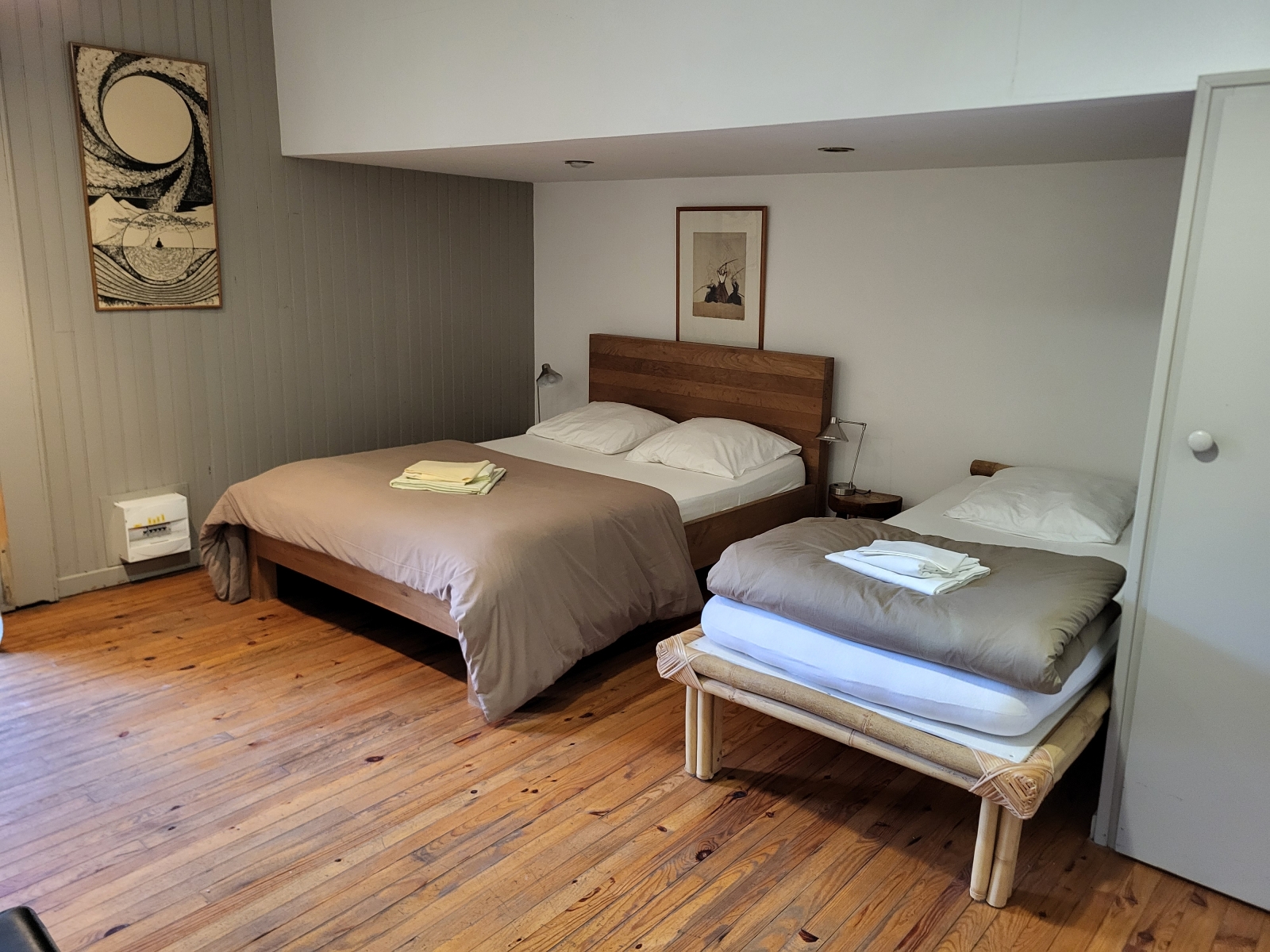 Cette chambre est équipée d'une fenêtre et d'une porte fenêtre vitrée ouvrant directement sur la prairie.