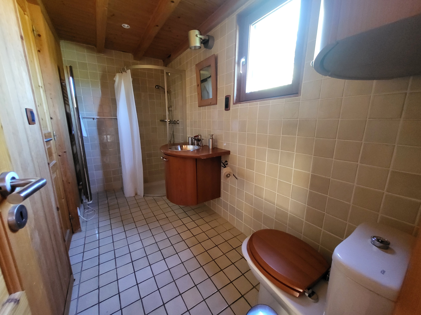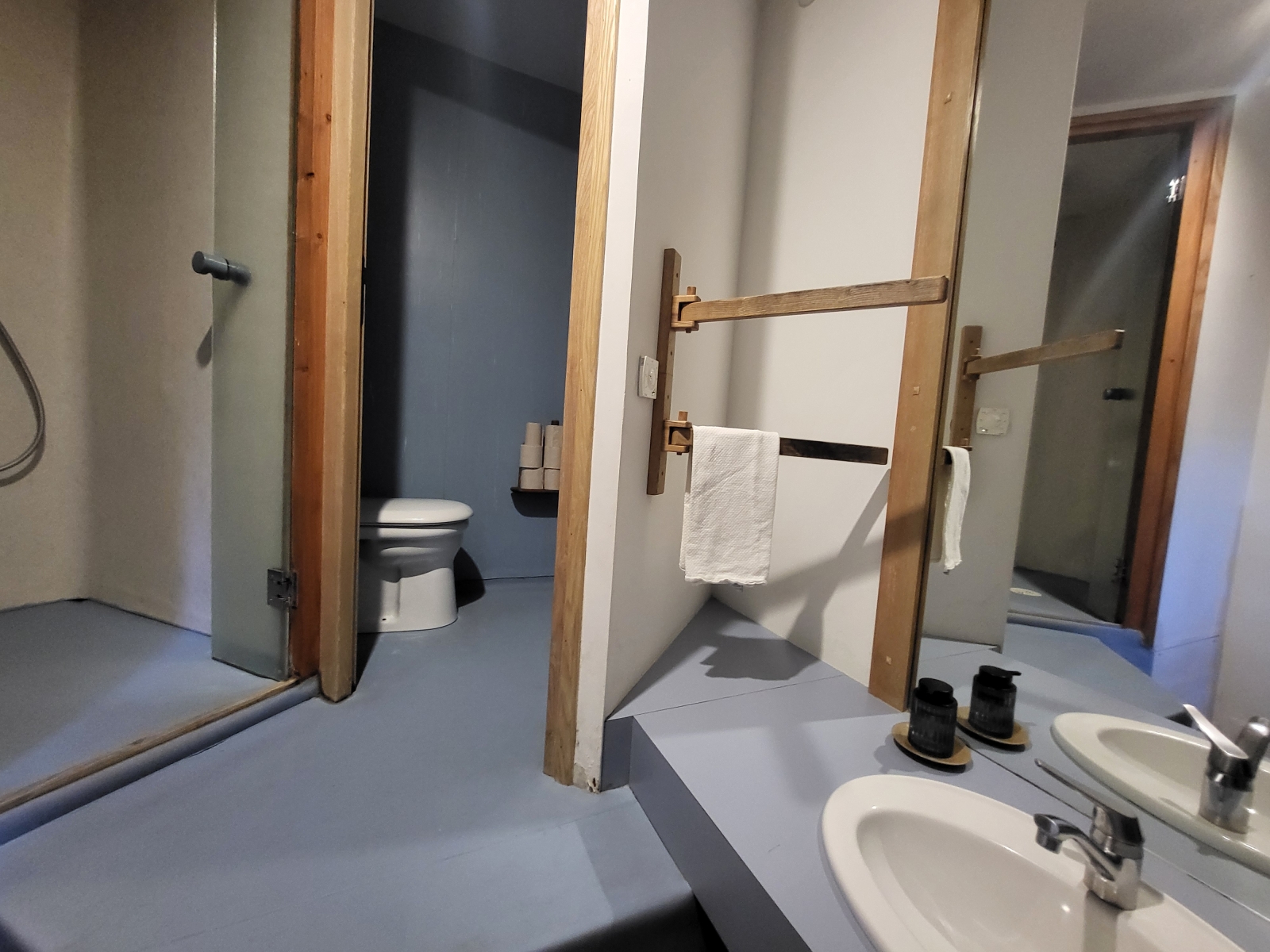 Vous profiterez des sanitaires communs (douche et WC) à l'extérieur de la chambre, à 20m en passant par l'extérieur sous une coursive. Les sanitaires hommes et dames sont séparés.