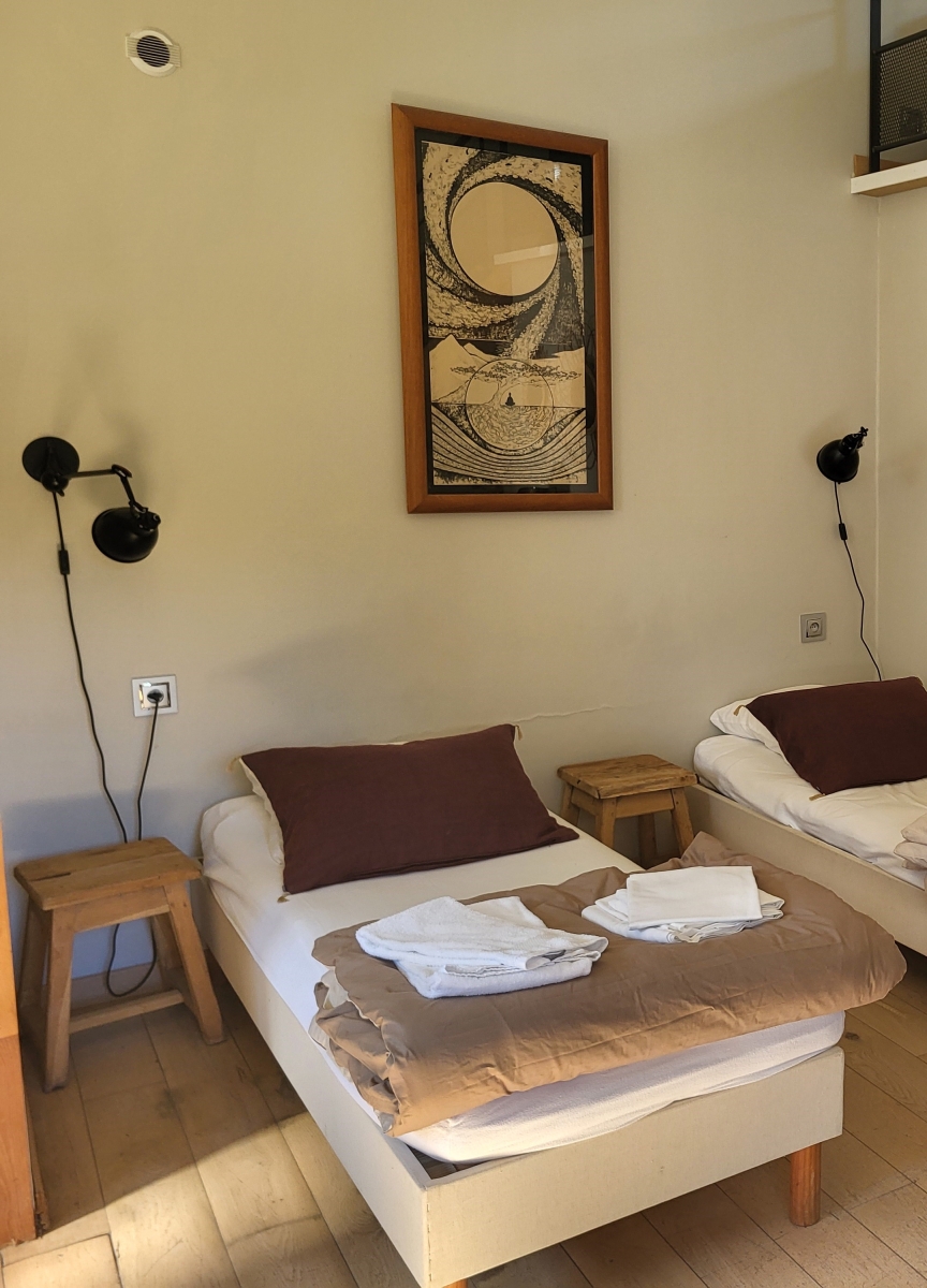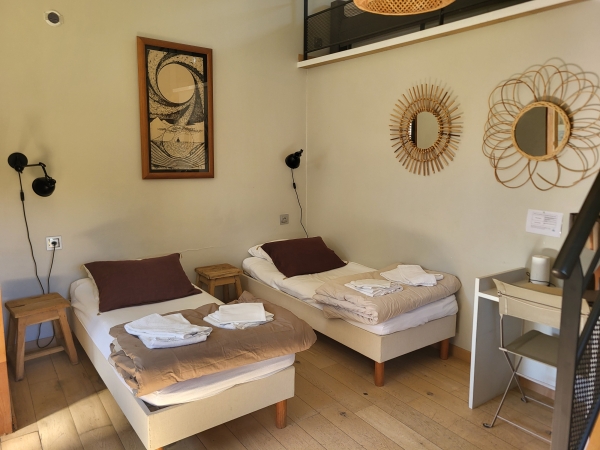 Cette chambre est située au centre du domaine, du restaurant et des espaces commun. Elle donne directement sur la salle Petit Dojo, lieu de pratique de votre groupe.