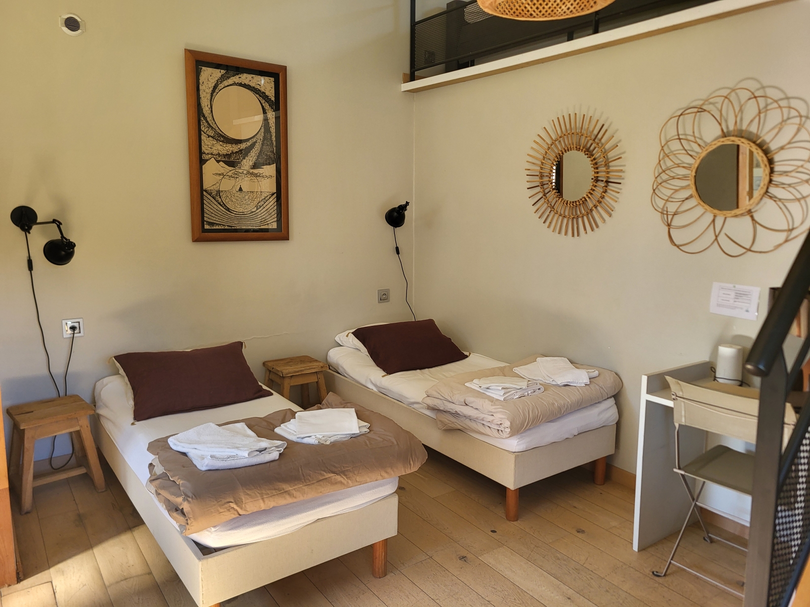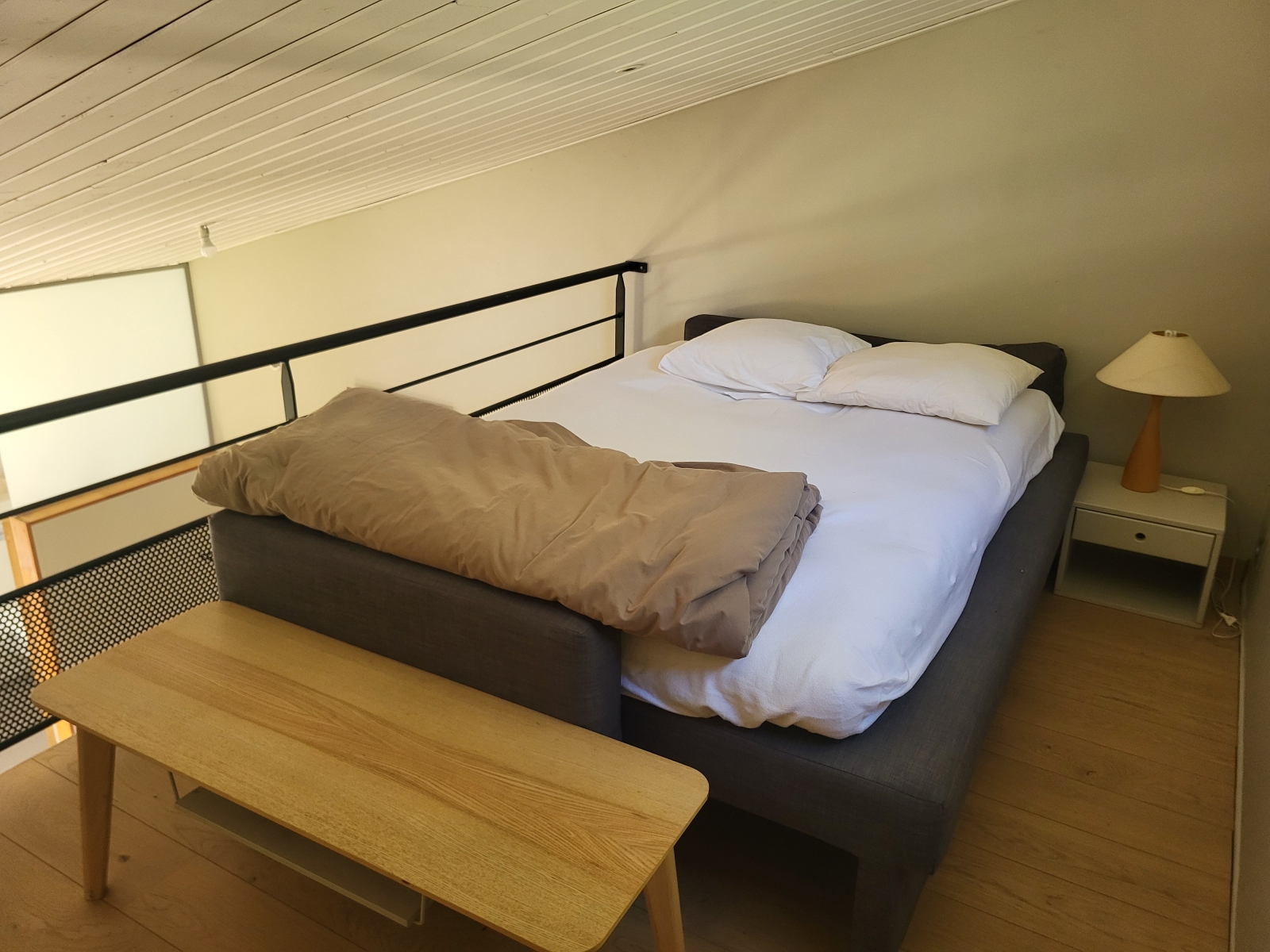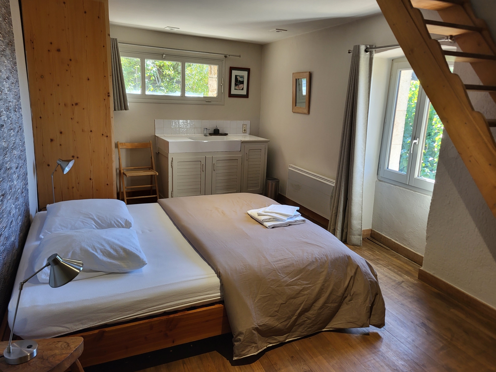 Ce duplex, est équipée d'un grand lit 160cm en bas ainsi que d'un lit 80cm à l'étage.