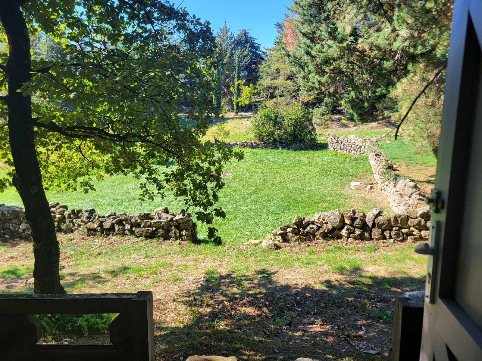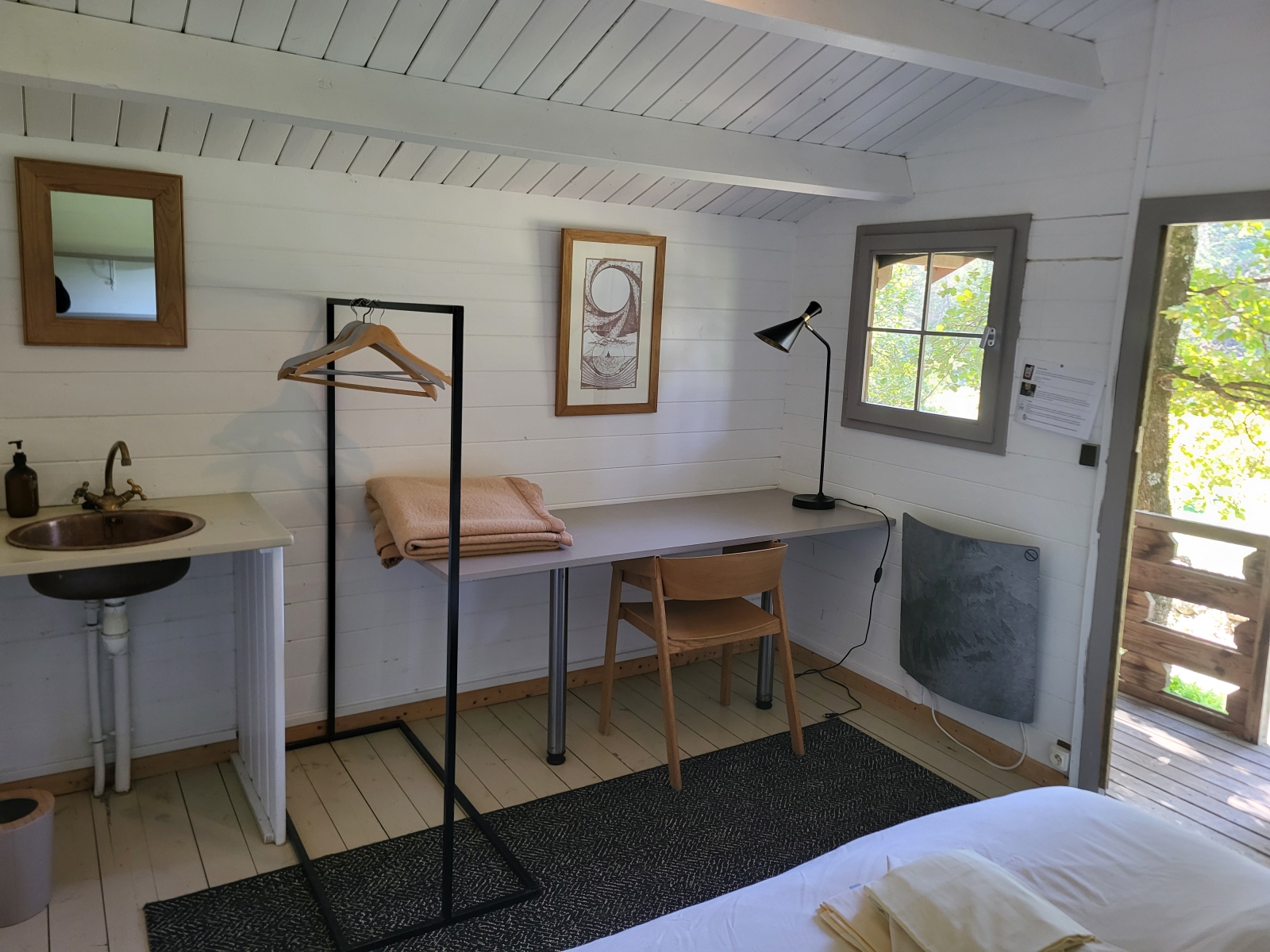 Équipée d'une fenêtre ainsi que d'une porte fenêtre vitrées, la chambre donne directement sur la prairie, sous une coursive abritant de la pluie.