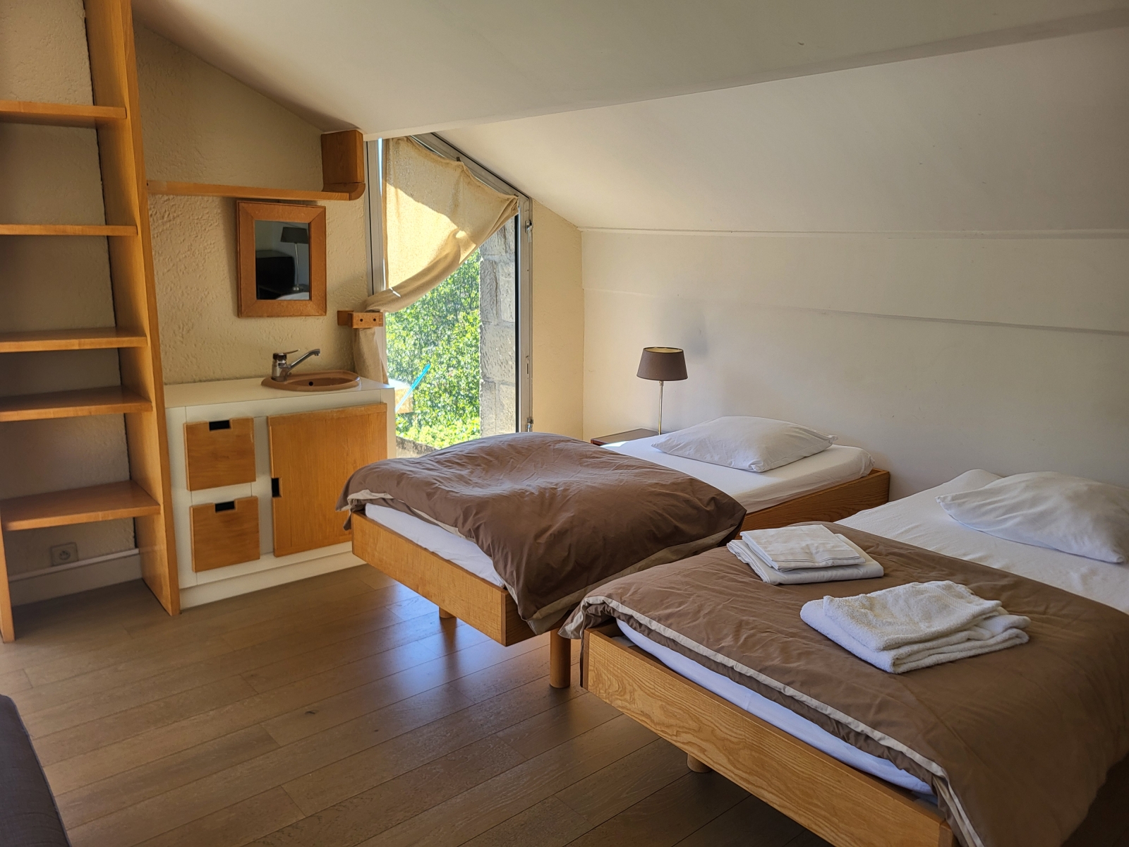 Cette chambre est équipée d'une fenêtre et d'une porte fenêtre vitrée ouvrant directement sur l'extérieur, sous une coursive abritée.