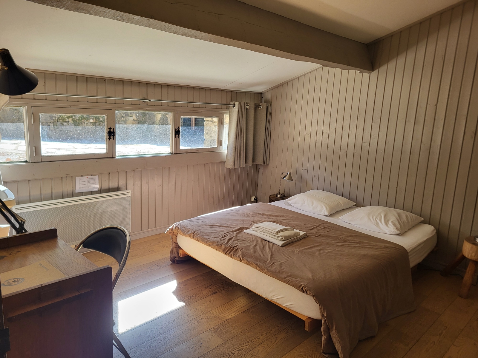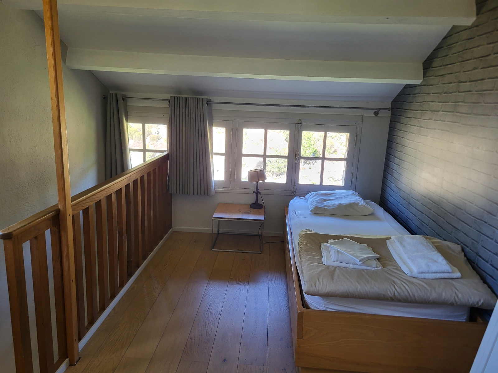 Cette chambre donne directement dans un couloir et n'offre pas de vue directe sur la nature (fenêtres hautes).