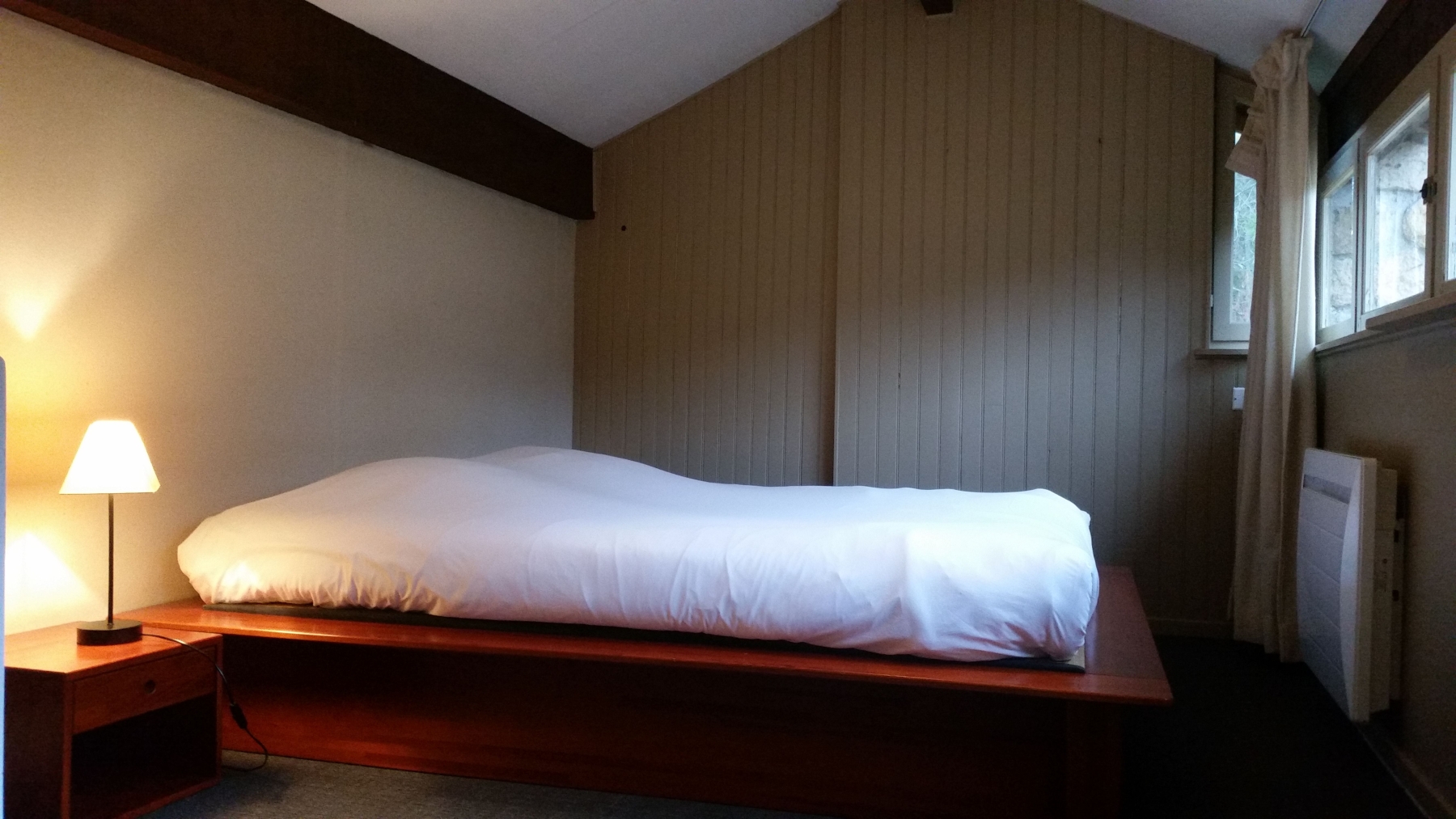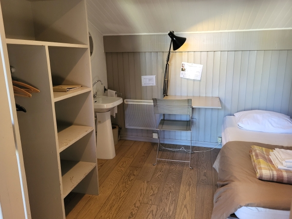 Équipée d'une fenêtre ainsi que d'une porte fenêtre vitrées, la chambre donne sous une coursive extérieure abritant de la pluie et menant jusqu'au sanitaires partagés.