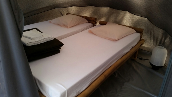 Dans le tipi, équipé d'électricité, vous trouverez un vrai couchage (matelas + sommier)  ainsi qu'une petite lampe de chevet.
