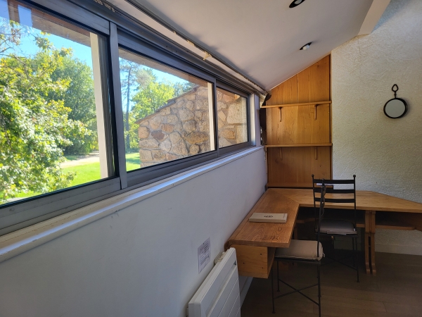 Petit chalet individuel équipé d'un lit 90cm et d'un bureau, situé au sud du domaine, à proximité de la piscine, des jardins, du Grand Dojo et du restaurant.
