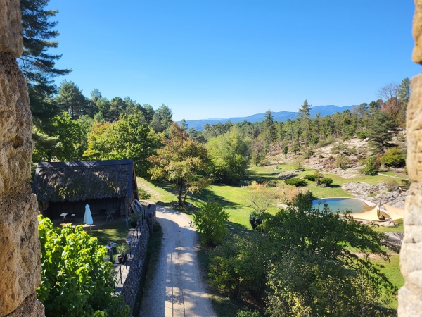 Grande tente Ecochic de 20m2 pour 1 à 3 personne(s), implantée sur la crête et offrant une vue très dégagée sur les monts d'Ardèche.