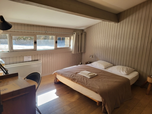 Chambre couple avec sanitaires privatifs N°60, légèrement excentrée mais très au calme, à 300m du restaurant et des salles.