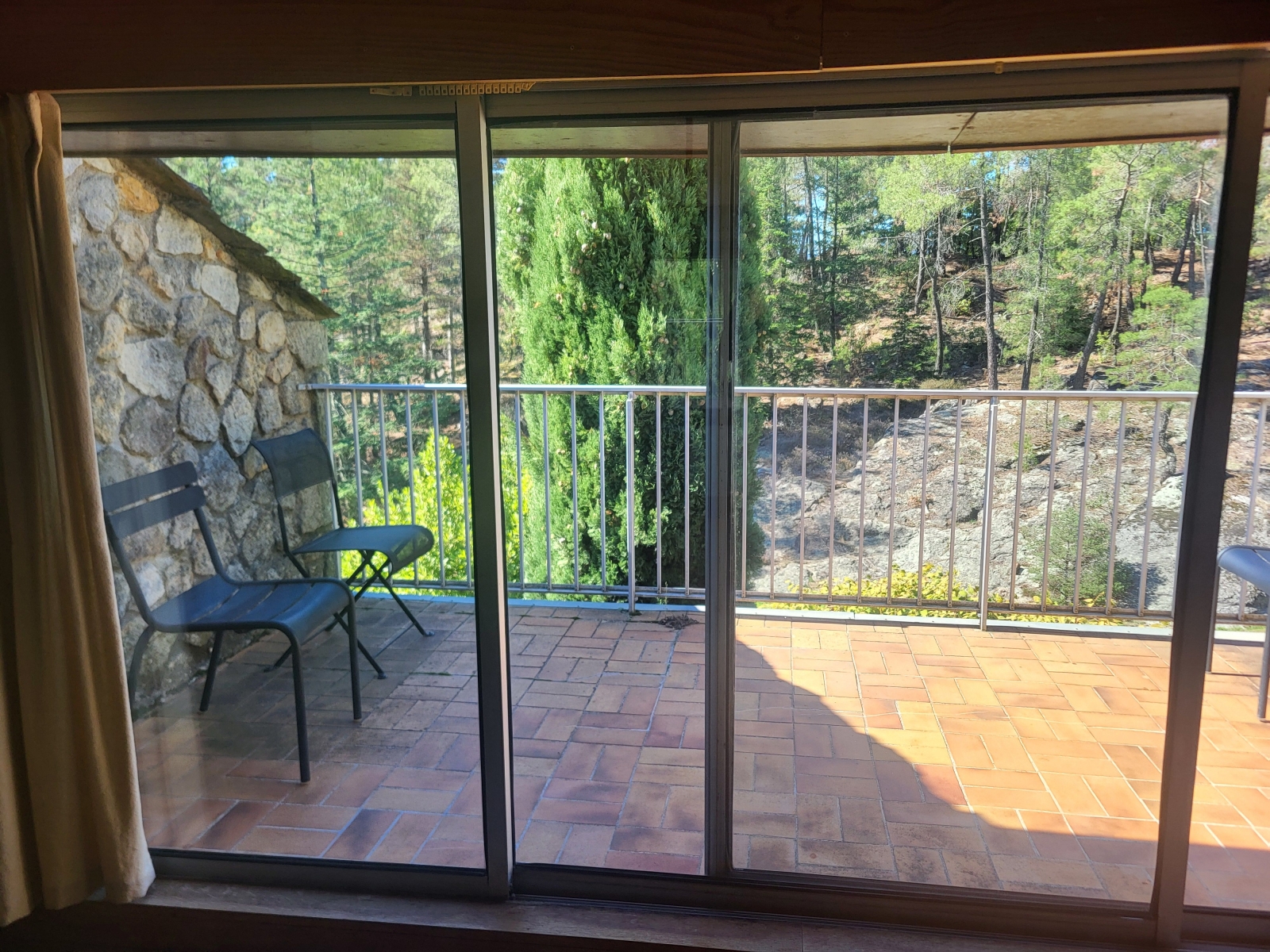 Équipée d'une fenêtre ainsi que d'une porte fenêtre vitrées, la chambre donne sous une coursive extérieure abritant de la pluie et menant jusqu'au sanitaires partagés.