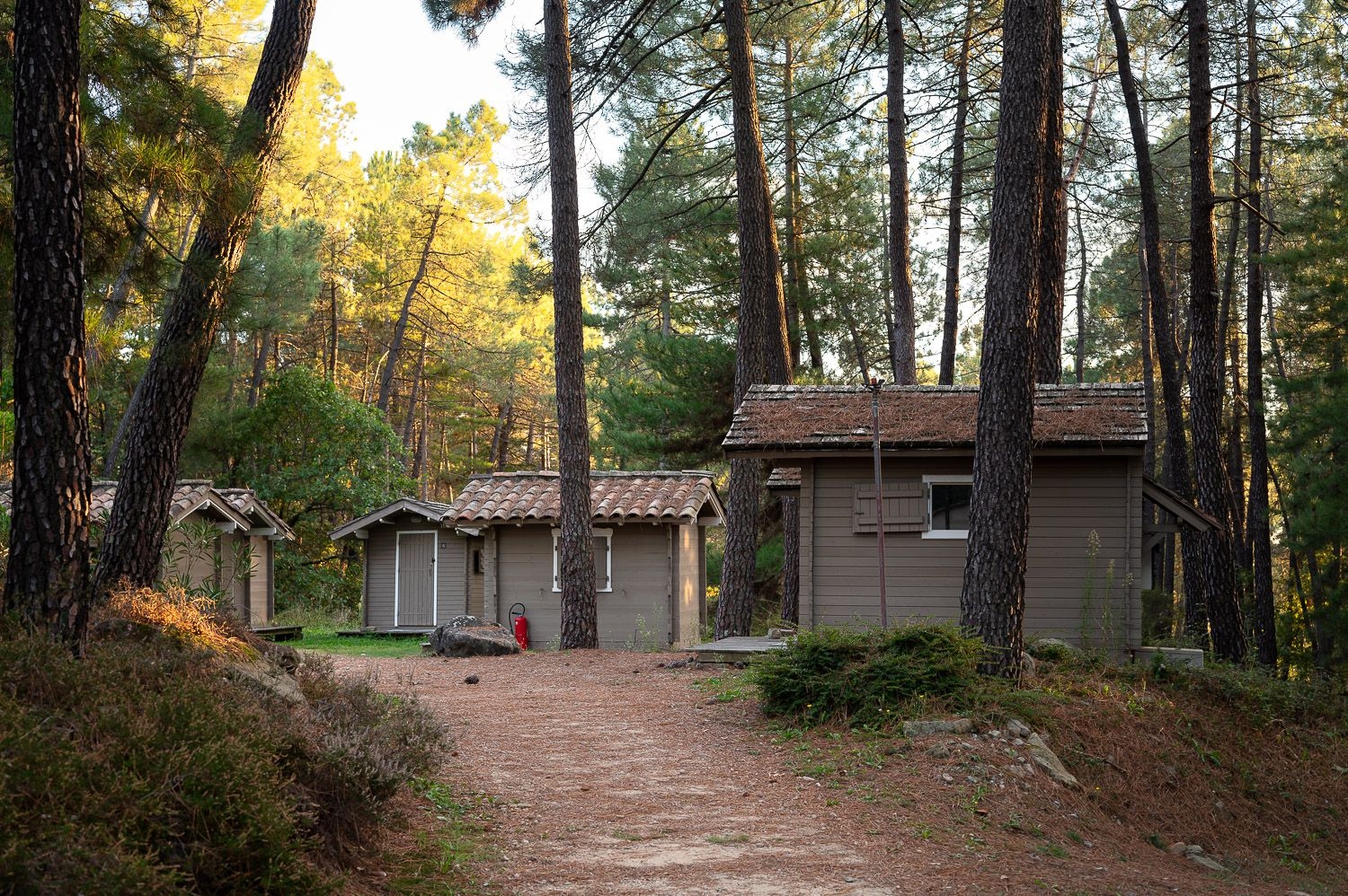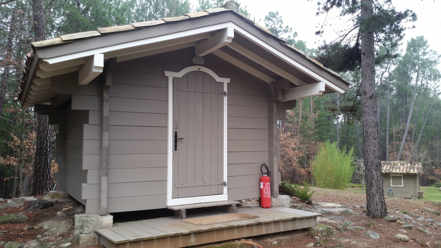 Petit chalet individuel équipé d'un lit 90cm et d'un bureau, situé au sud du domaine, à proximité de la piscine, des jardins, du Grand Dojo et du restaurant.