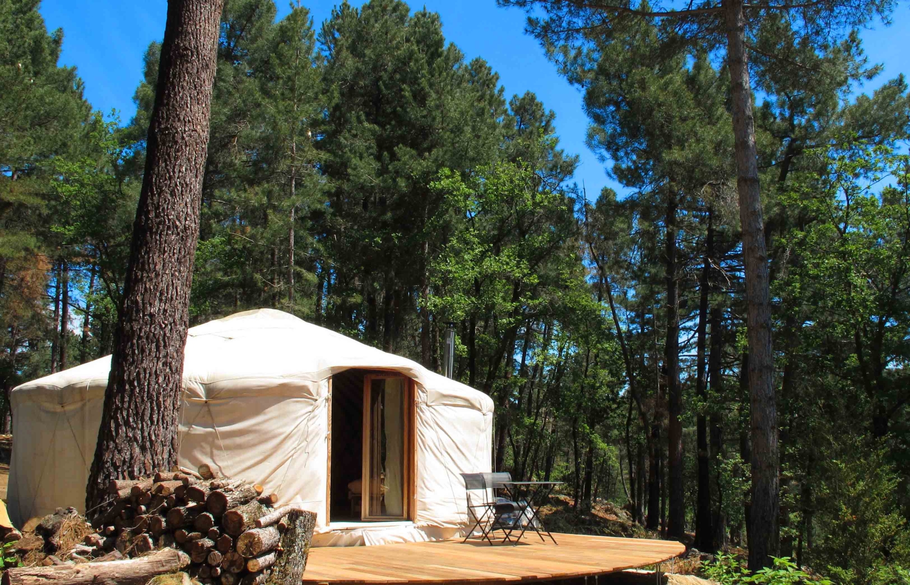 Grande tente Ecochic de 20m2 pour 1 à 3 personne(s), implantée sur la crête et offrant une vue très dégagée sur les monts d'Ardèche.