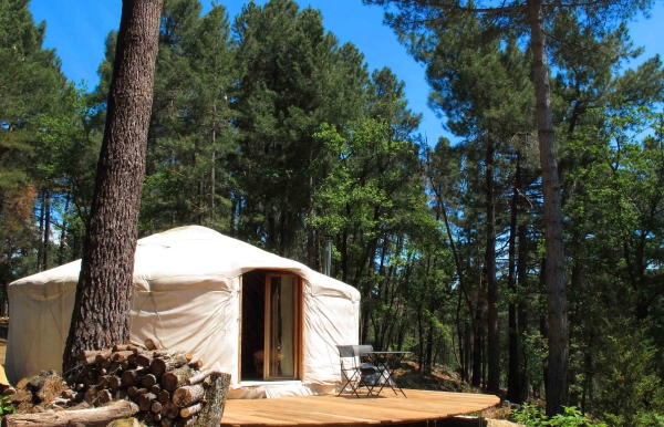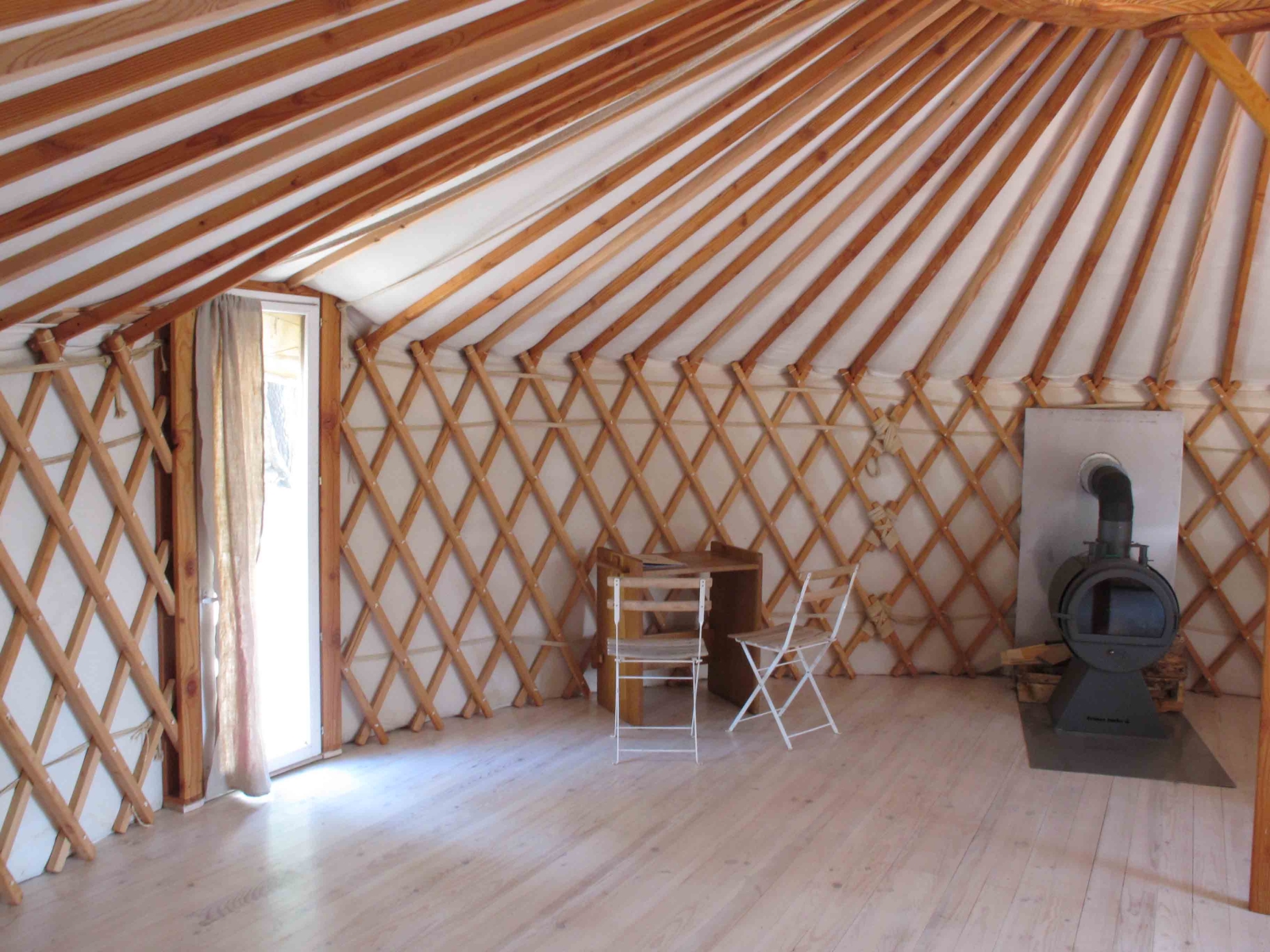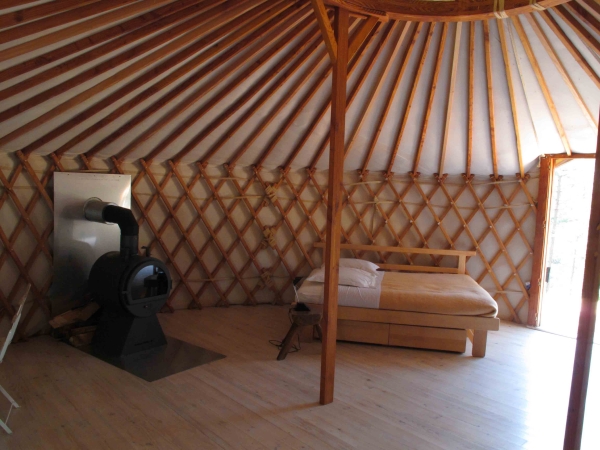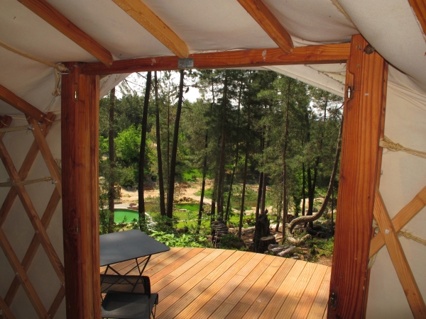 Grande yourte de 35m2 équipée de 4 lits 80cm pouvant former 2 lits 160cm, située sur les hauteurs à l'ouest du domaine,  proche des bassins et des jardins. Sanitaires en commun (douche et wc) dans un bâtiment annexe à 50 mètres.