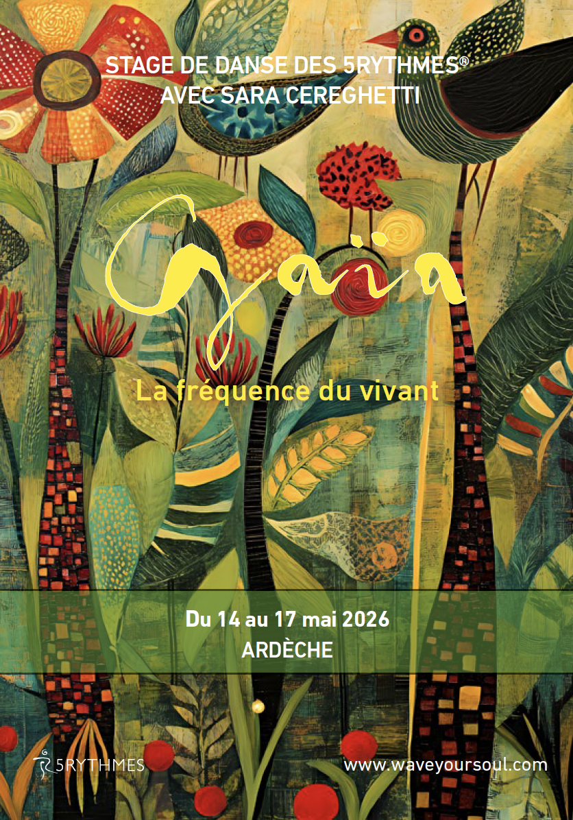 Créée par Gabrielle Roth aux Etats-Unis dans les années ’70, la Danse des 5Rythmes® est une pratique spirituelle incarnée : le mouvement libre rencontre et explore les qualités et les textures de cinq rythmes (fluide, staccato, chaos, lyrique et quiétude) et se déploie dans des « vagues » successives. L’expérience et la pratique de cette carte – l’expérience du corps qui respire, danse, transpire – permet de nourrir des chemins de présence, de transformation, de guérison.