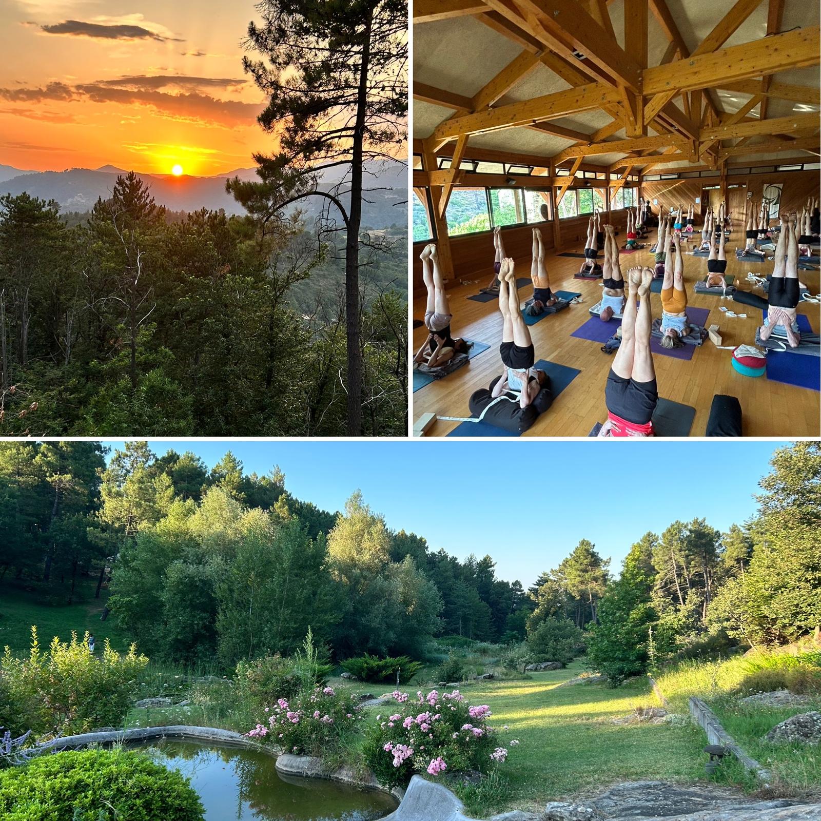 30 à 45 min de pranayama avant le petit-déjeuner, 2h30 d'asanas le matin et 2h30 d'asanas (pratique restaurative et postures inversées) l'après-midi.